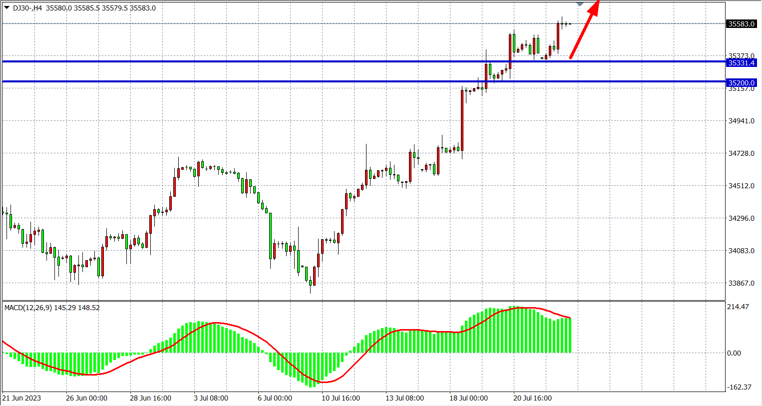 4小时图看,道指继续走高至35500之上,MACD量能维持零轴上放量,多头趋势强劲,支撑关注35330-35200附近,阻力35700-36000。