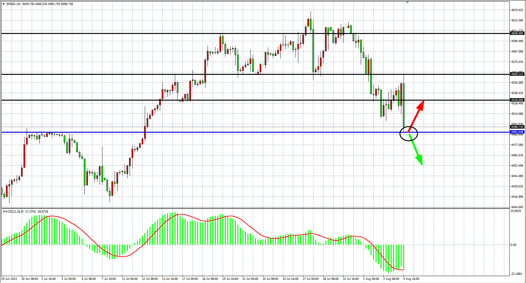 4小时图看,标普进一步下跌至4490附近,MACD量能在零轴下放量,短线延续空头,阻力关注4530-4560附近。
