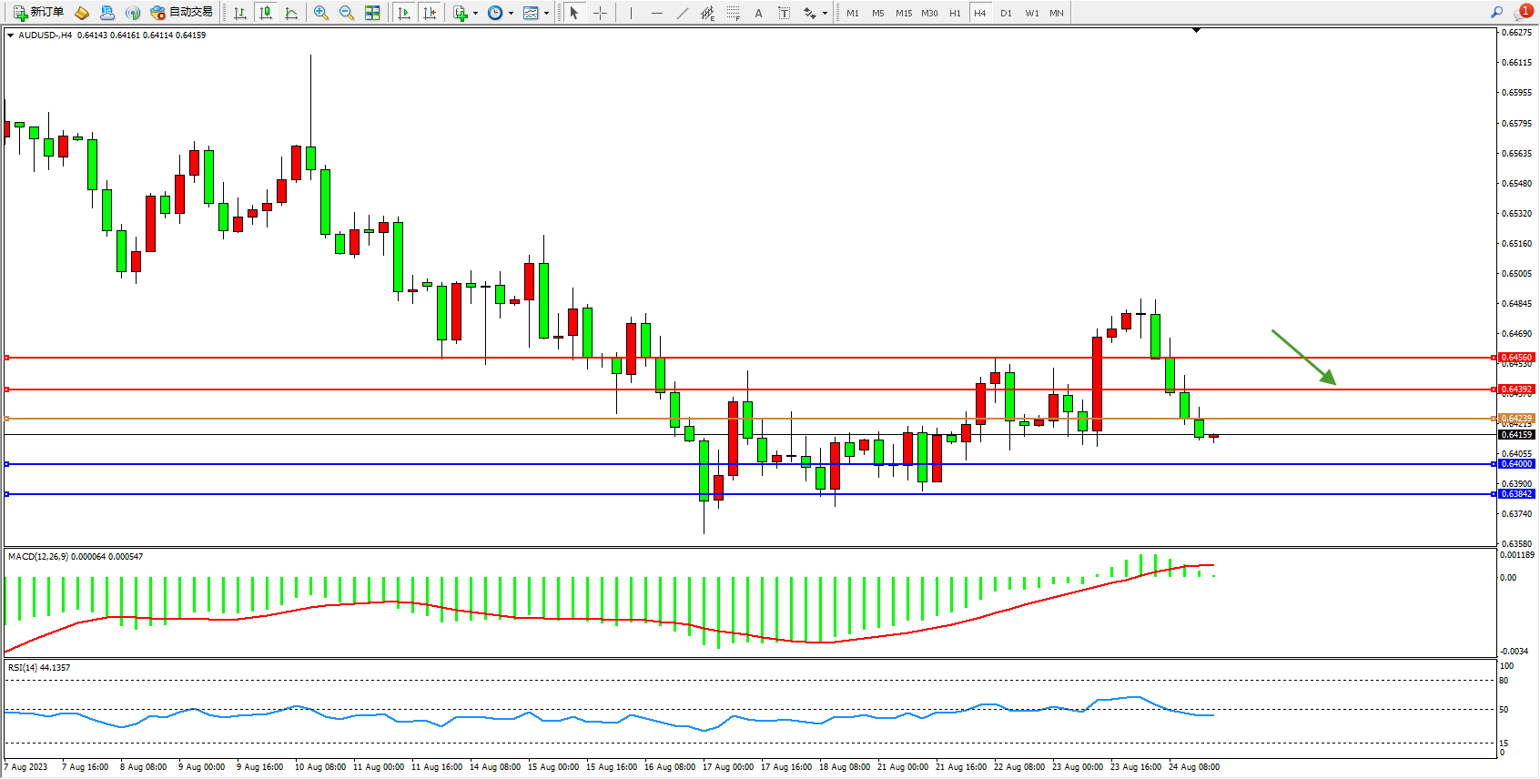 交易策略:0.64239下方看跌,目标0.64000  0.63842