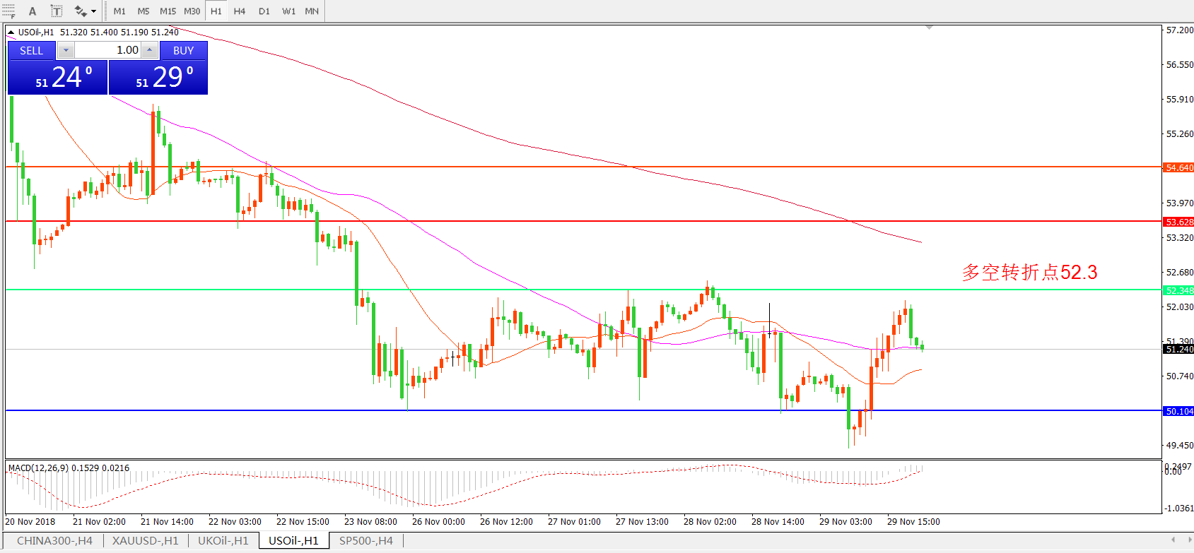 小时图看,油价快速下探50美元关口后快速反弹,但面对短期多空转折点52.30依然无力上行,整体走势偏弱,MACD绿柱缩短,整体思路依然以逢高做空为主。