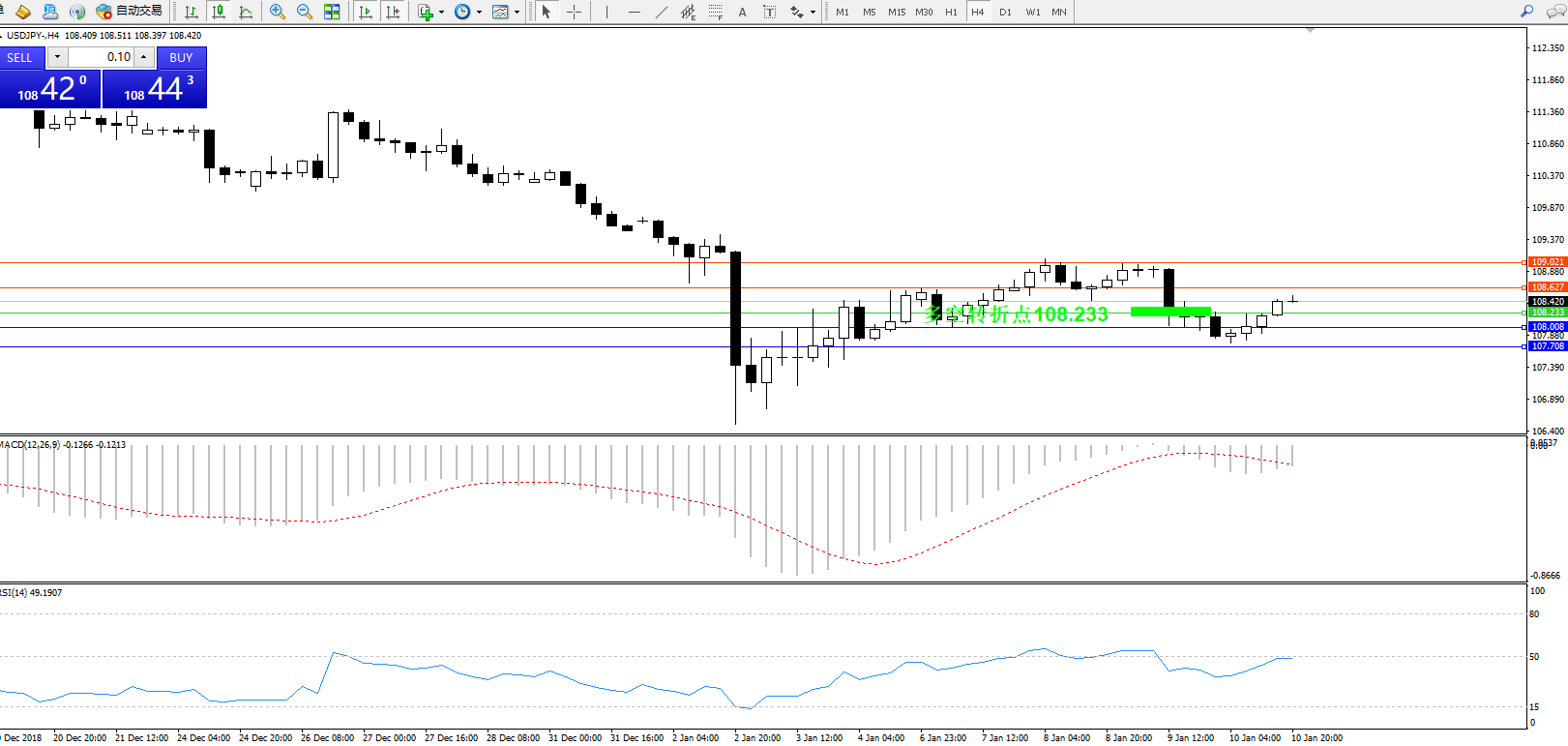 交易策略:108.233上方看涨,目标108.627109.021