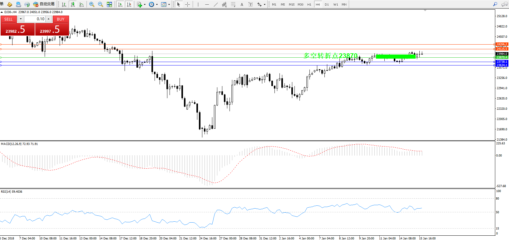 道琼斯指数DJ30—— 4小时K线图显示:
