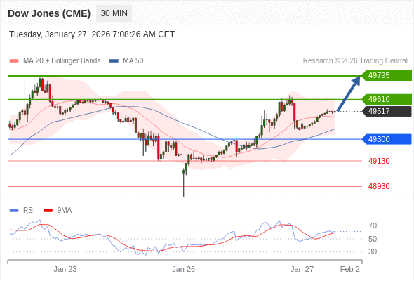 在 49300 之上,看涨,目标价位为 49610 ,然后为 49795 。