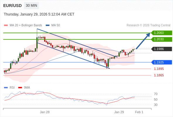 在 1.1925 之上,看涨,目标价位为 1.2030 ,然后为 1.2060 。