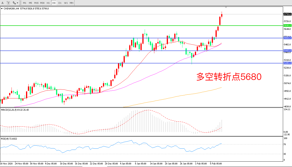 4小时图看,沪深300阳线连续拉升, 5680阻力被突破,短期表现十分强势,行情进入上行加速期,MACD红柱增加,RSI指标向上,节后延续上行概率较大。