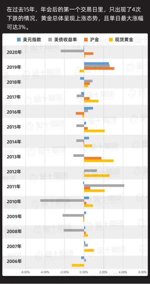 杰克逊霍尔央行年会往往会给市场造成波动,在过去15年,年会后的第一个交易日里,黄金总体呈现上涨态势,且单日涨幅最大可达3%。不仅如此,每年的杰克逊霍尔全球央行年会,都会为年底现货黄金的单边行情带来指引。