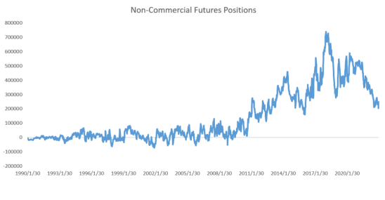对于大基金经理来说,标普指数,美债,商品三大类别,如何投资回报率更有吸引力。在标普指数和10年期中,显然标普指数的回报率不如美债吸引人,美债成为基金经理的优先选择之后,商品也总是要选配的。这三张图显示,美国原油期货投机者头寸数量下降,美国原油产量上升,美国能源股基金ETF价格上升。