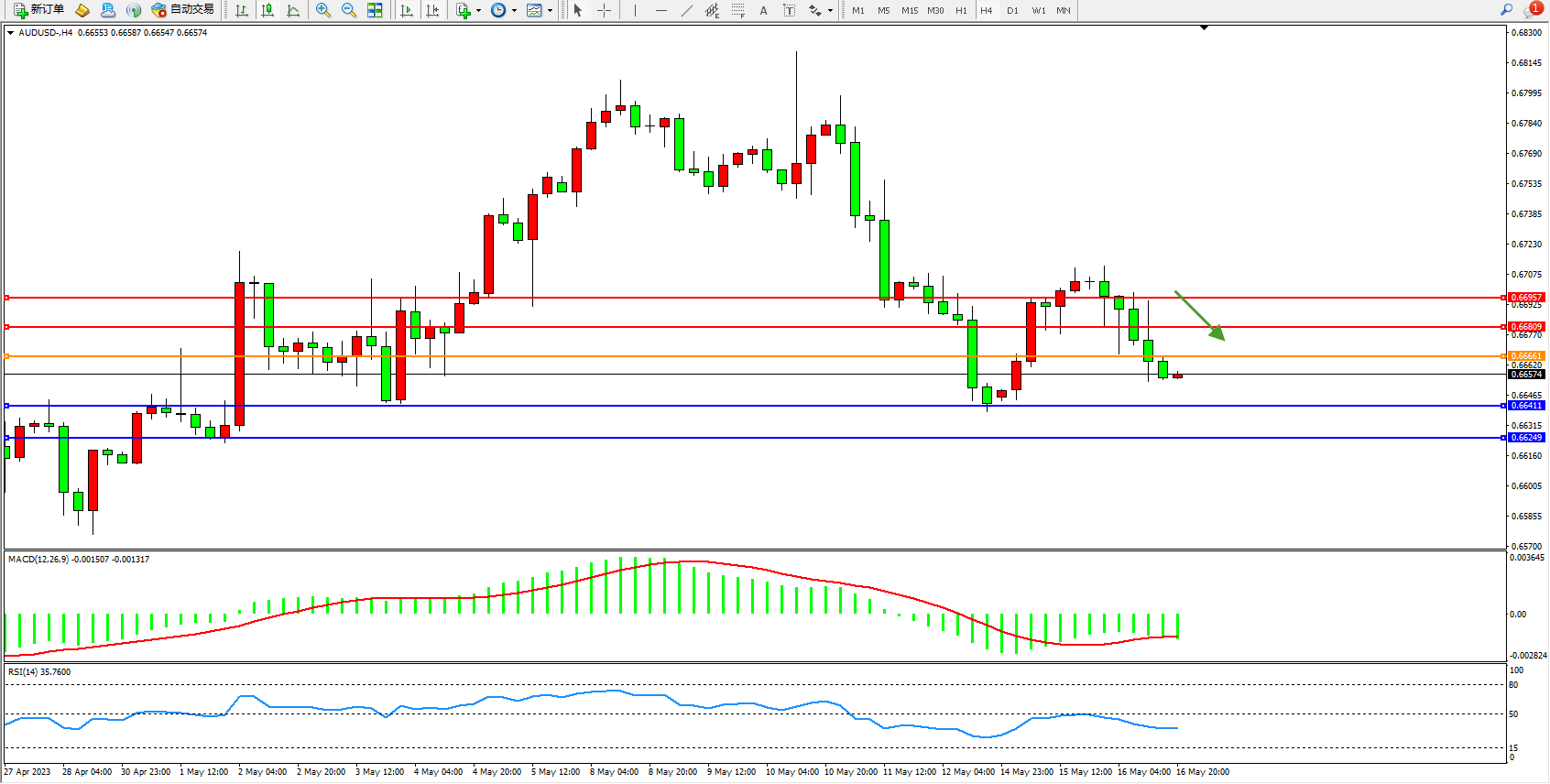 交易策略:0.66661下方看跌,目标0.66411 0.66249